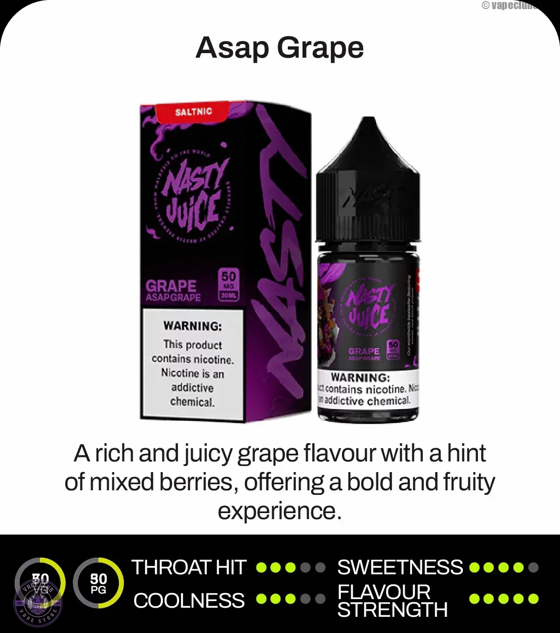 سالت انگور نستی سری OG اوجی | Nasty Asap Grape OG Series ترکیبی است از انگور مشکی بالغ، توتهای جنگلی و اندکی خنکی ملایم که در بستر فرمول سالت طراحی شده است. این سالت با نیکوتین 35 میلیگرم و حجم 30 میلیلیتر عرضه میشود و مخصوص دستگاههای پاد / MTL است.