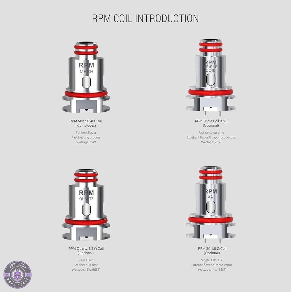 کویل اسموک آر پی ام Smok RPM Coil با مقاومت های 0.3، 0.4، 0.6، 0.8، 1.0 و 1.2 عرضه میشوند. این کویل ها برای مصرف انواع سالت نیکوتین و ایجویس ها بصورت محدود با مقاومت 0.4 مناسب میباشند و برای پاد سیستم های اسموک نورد Smok Nord مناسب هستند.